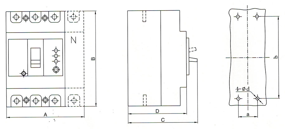 4)本系列三极和四极断路器接单相负载时,相线接A极,中性线接C极,不要接B极。
