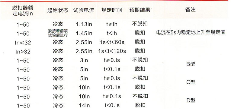注:IAt为500A或C、D型瞬时脱扣范围的上限,两者取较大值。I△n≤0.03A,可用外0.25A替代5l△n。